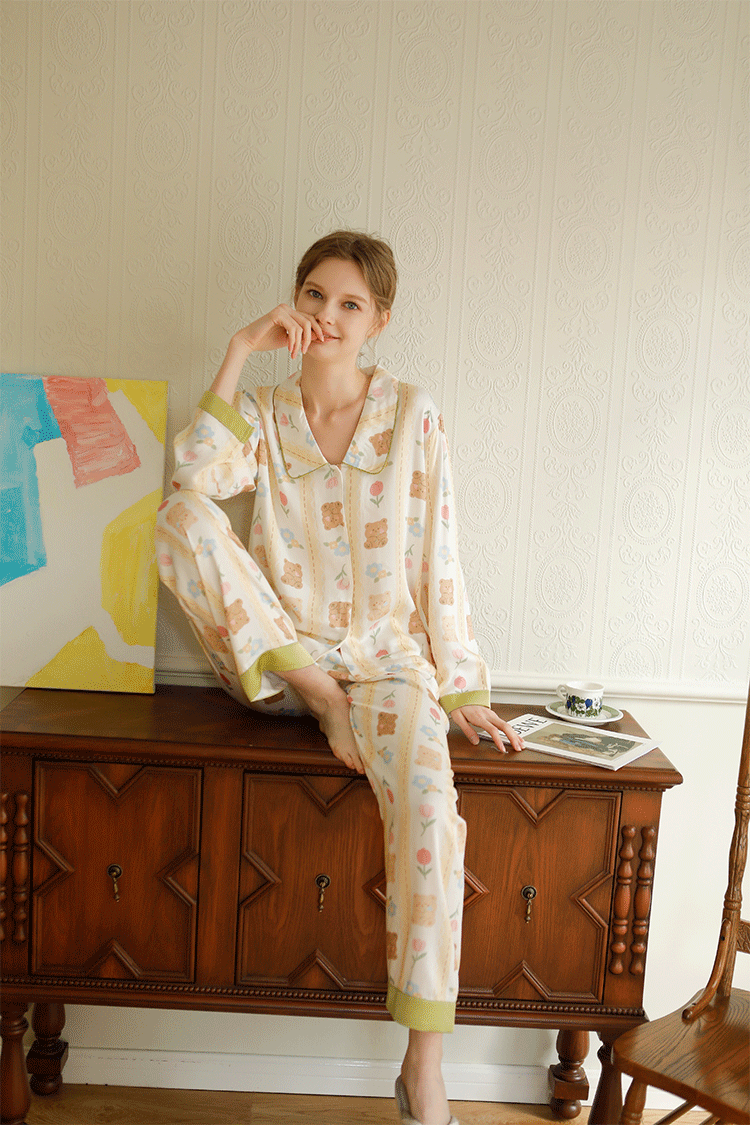 Paired with matching full-length trousers, this two-piece set provides a breathable, easy silhouette that feels cool and gentle against the skin. Made from viscose fiber, it offers a silky-soft texture with a natural, lightweight drape for all-day comfort.